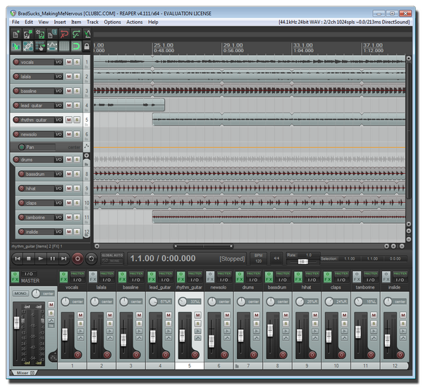 L'intérêt de REAPER réside dans son côté immédiat : vous pouvez très simplement activer telle ou telle piste pour l'enregistrement, rendre une piste muette, l'écouter en solo, ou lui ajouter des effets. La table de mixage est accessible en permanence mais peut être cachée pour laisser toute la place aux pistes audio.